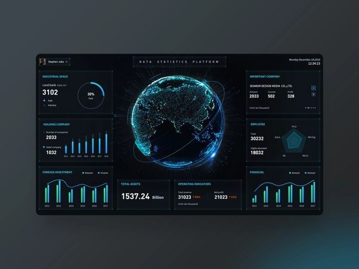 企業(yè)數(shù)據(jù)往往枯燥且復(fù)雜,而這類設(shè)計(jì)卻讓數(shù)據(jù) “活” 了起來。深色背景與熒光色、科技藍(lán)的碰撞,既拉滿科技氛圍,又通過色彩區(qū)分?jǐn)?shù)據(jù)維度,讓層級(jí)一目了然。環(huán)形圖、折線圖等可視化組件,把營收、用戶增長等數(shù)據(jù)動(dòng)態(tài)展示,仿佛數(shù)據(jù)在 “講述” 企業(yè)故事。這讓我們思考:數(shù)據(jù)類 UI 不該只是 “數(shù)據(jù)的容器”,更應(yīng)是 “數(shù)據(jù)的翻譯官”,蘭亭妙微在做類似設(shè)計(jì)時(shí),也會(huì)努力讓專業(yè)數(shù)據(jù)變得更易感知、更能輔助決策。